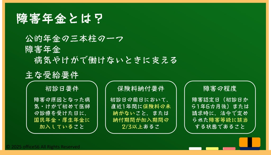 障害年金とは、病気やけがが原因で生活や仕事に制限が出た人に支給される公的年金です。