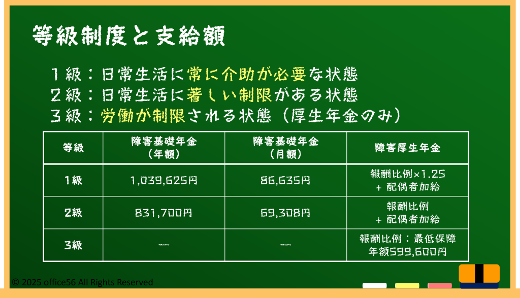 障害年金は、障害の程度によって1級、2級、3級(厚生年金のみ)の等級に分けられます。