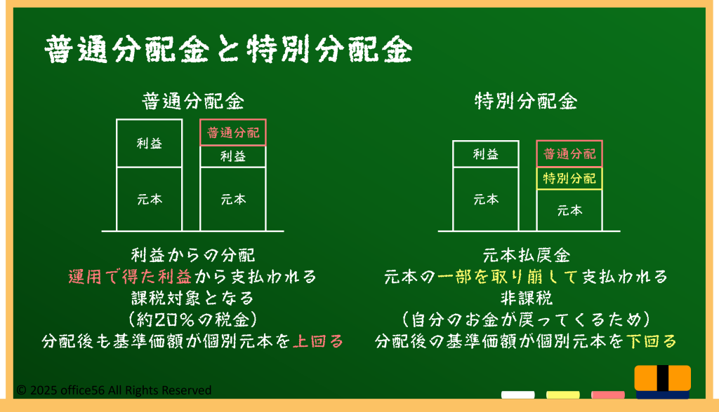 利益の一部を分ける「普通分配金」と、元本を削って支払う「特別分配金」です。普通分配金は課税対象ですが、特別分配金は元本の払い戻しにあたるため課税されません。