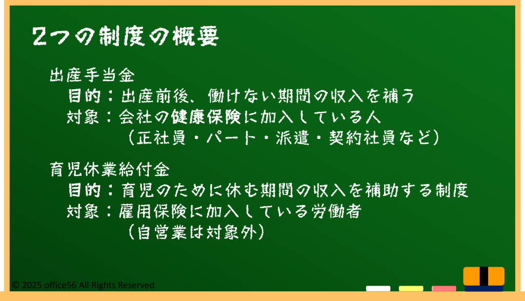 出産手当金と育児休業給付金は、どちらも「働けない期間の収入をサポートする制度」ですが、役割や受け取れる人、金額には違いがあります。