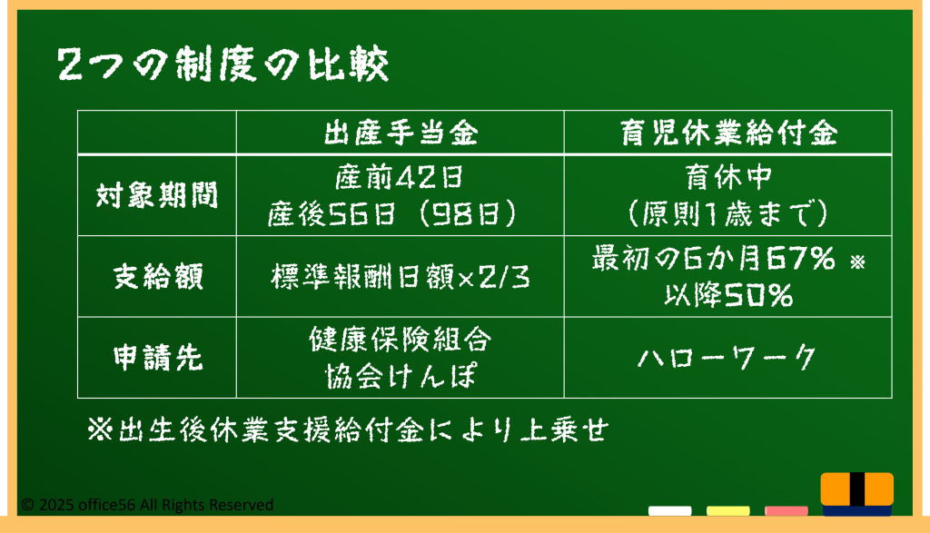 出産手当金と育児休業給付金の大きな違いは「いつもらえるか」と「どこからもらえるか」です。