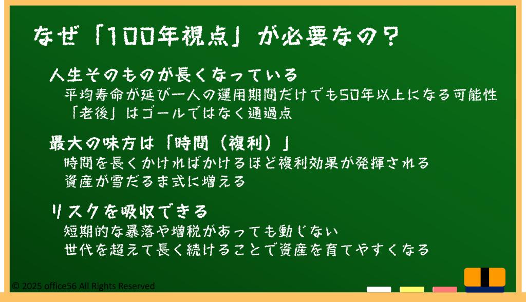 100年視点で考えることで、多少の相場変動や税金があっても、全体として資産が育つ構造を作りやすくなるのです。