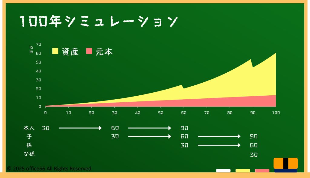 つまり、30歳からの100年間、資産が「あなた → 子 → 孫 → ひ孫」へと受け継がれていく流れです。