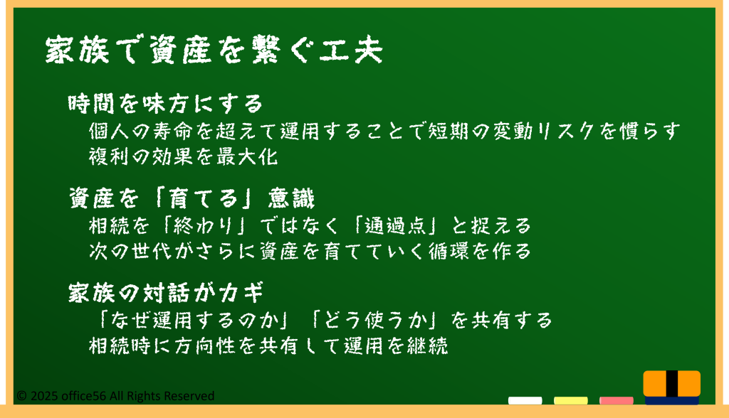 これは、一人で完結する資産形成ではなく、家族全体でお金を育て、つないでいく考え方です。