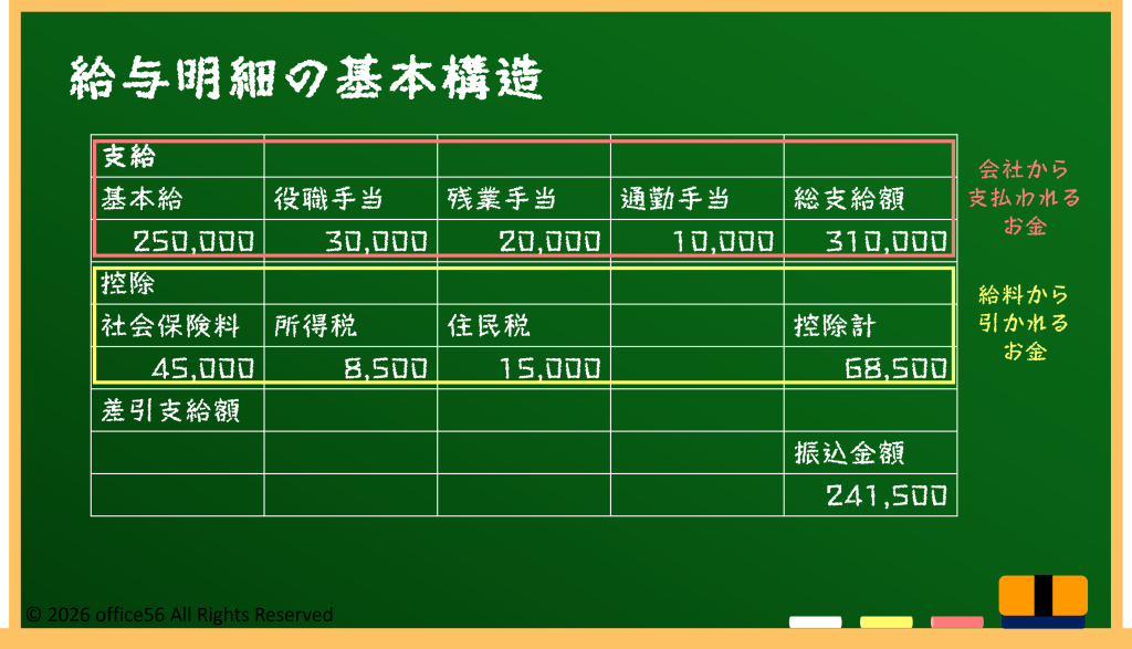 給与明細は、大きく分けて「支給」「控除」「差引支給額」の3つで構成されています。