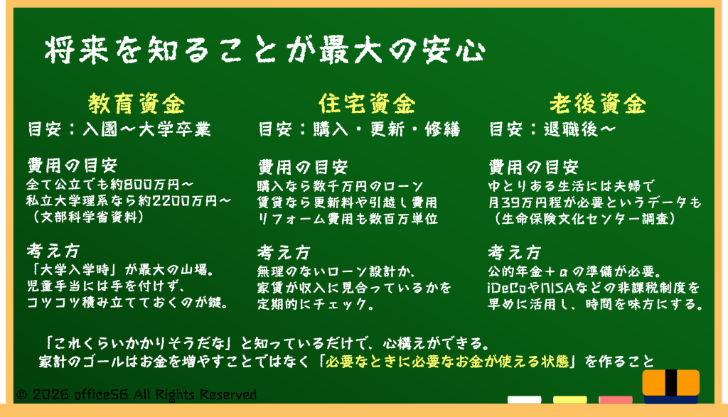 教育費や住宅、老後の生活費など、「いつ・どれくらい必要か」がぼんやりしていると、不安は必要以上に膨らみます。